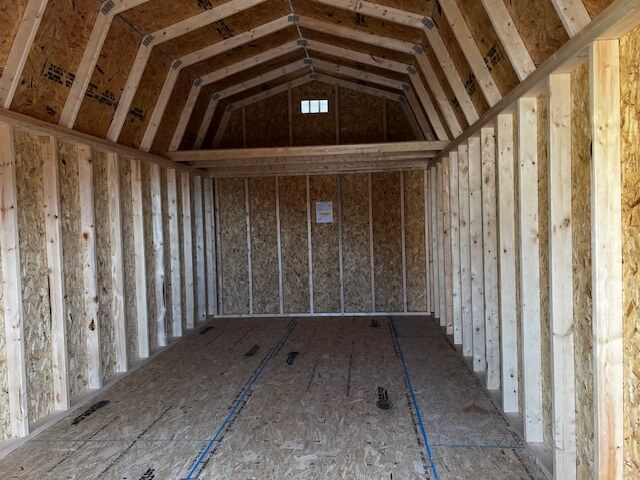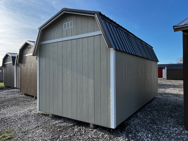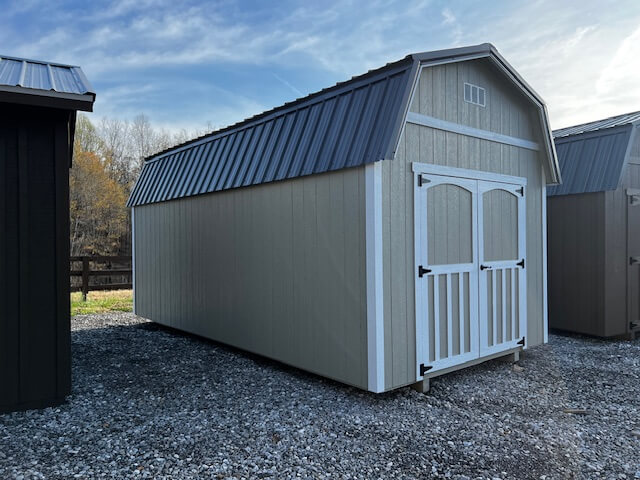 Shed Type: Jefferson Shed Building Size: 10′ x 20′ Siding Type: Smart Panel Siding Color: Sherwin-Williams (Chatroom) Trim Color: White Roof Color: Bronze Doors: 6′ double barn doors Other: 4′ storage loft