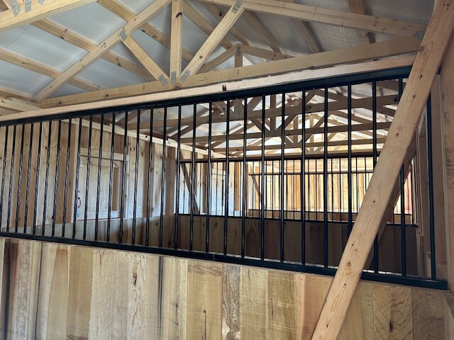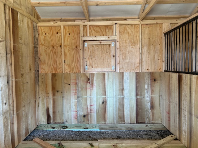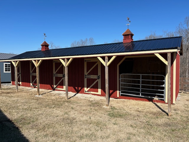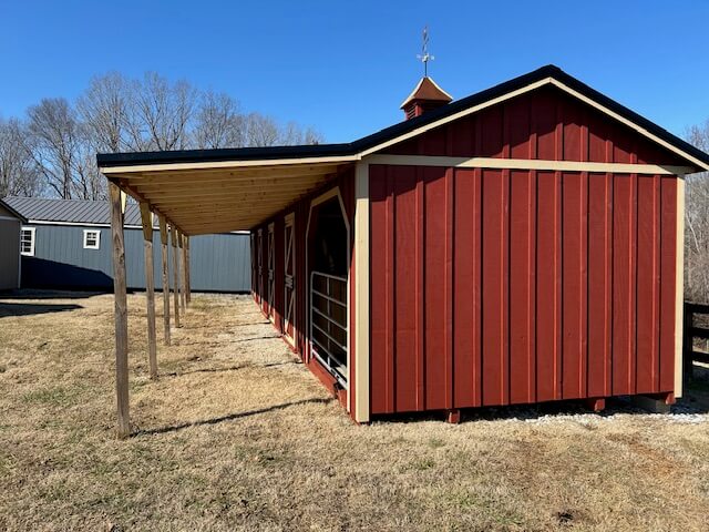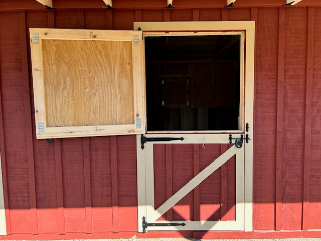 Windows: (1) 30″x30″ hinged wood window in the back of the run-in, each stall, and the tack room.