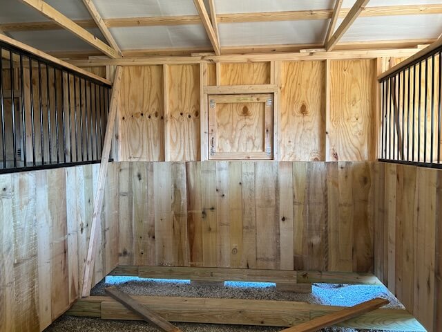 Stall Lining: Run-in and stalls lined with 48″ high poplar hardwood kick boards.