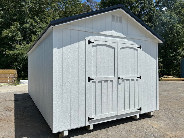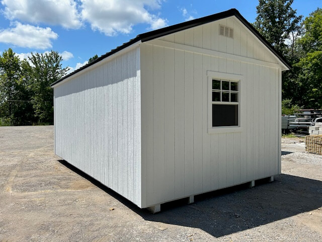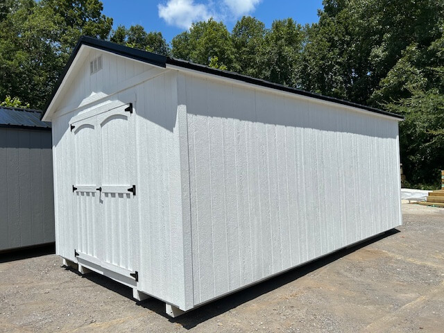 Shed Type: Classic Shed Building Size: 12′ x 20′ Siding Type: LP SmartSide Siding Color: Sherwin Williams (White ) Trim Color: Sherwin Williams (White) Roof Color: Black Doors: 6′ double door/ 30×36 window